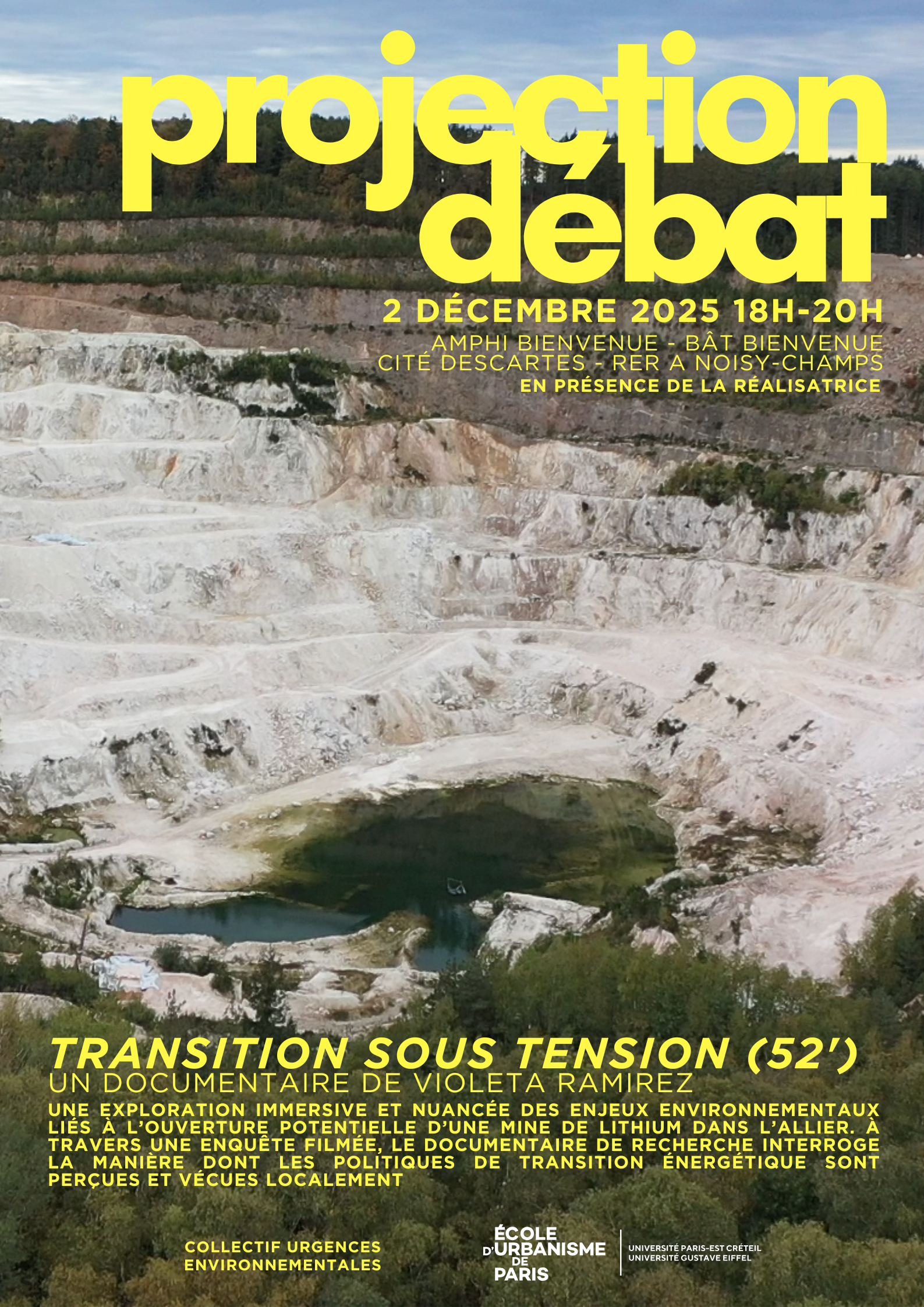 L’événement est co-organisé par le collectif Urgences environnementales, l'École d'urbanisme de Paris et l'UFR SHS de l'Université Gustave Eiffel. La projection sera suivie d’un débat animé par les organisateurs et d’un moment d’échange avec le public.